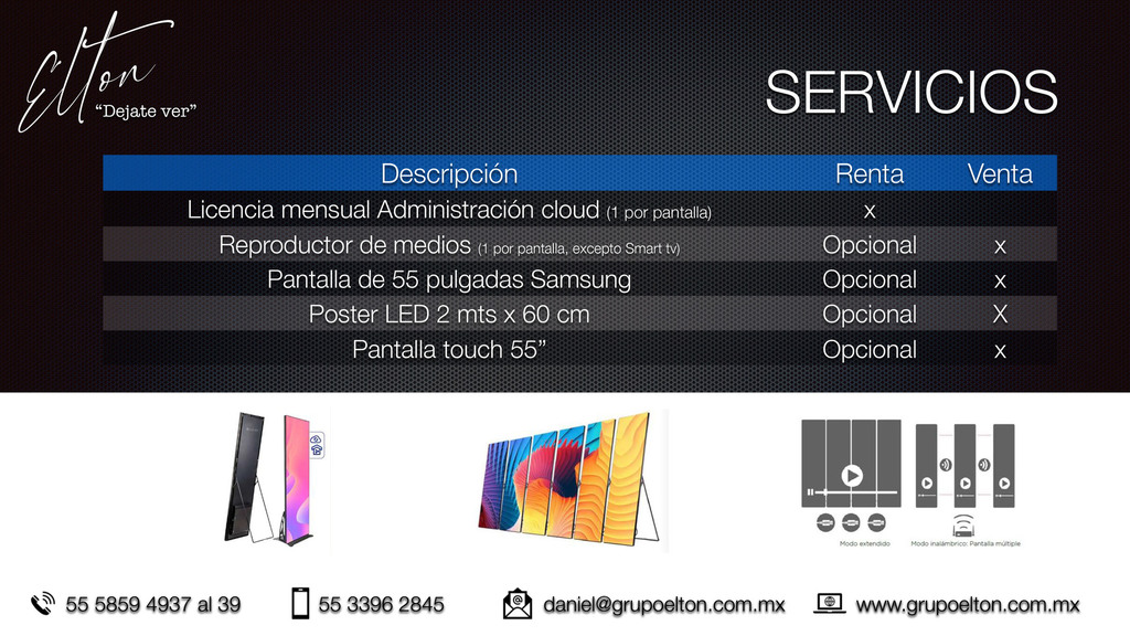 Podemos administrar tus pantallas ademas de renta, venta y mantenimiento de equipo nuevo, pantalla, pantalla led, banner y monitores según se adapte a lo requieras y tu presupuesto.